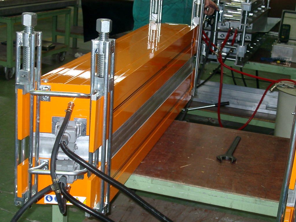 Modular Presse in Aluminium, bestehend aus 260 mm langen Elementen. Verfügbar für verschiedene Bandbreiten von 600 mm bis 2600 mm. Die gewünschte Verbindungslänge wird durch Gruppieren der entsprechenden Elemente erreicht. Jedes Element ist eigenständig, da es ein pneumatisches Druck-, Heiz- und Kühlsystem enthält. Es besteht aus zwei Teilen; dem Oberen und dem Unteren; beide sind ausgestattet mit Aluminiumgittern in denen sich die Widerstände, die Temperatursensoren und das Kühlsystem befindet. Vollautomatischer Prozess, der über den Schaltkasten programmiert wird (Heizen, Haltezeit und Kühlen). Die Elemente werden zusammengebaut, so dass diese auch auf unebenen und geneigten Oberflächen montiert werden können.