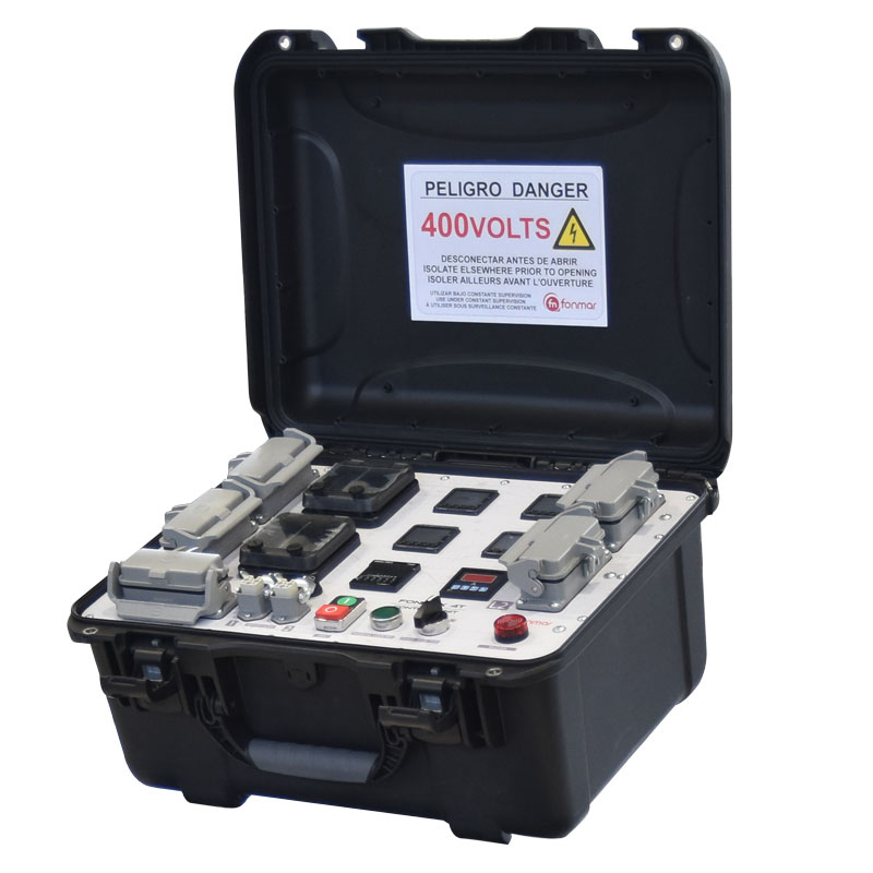 Boitier de contrôle pour deux ou quatre plateaux. Facilement programmable. Contrôle automatique de tout le processus de jonction une fois enregistrés la température de consigne des plateaux, le temps de maintien, la température de refroidissement et le niveau de pression. Il incorpore un thermomètre et un ampèremètre par plateau individuel afin de détecter le moindre problème provenant du système électrique, ainsi qu’un voltmètre de lecture de la tension d’entrée pour surveiller l’alimentation électrique. Il inclut également un régulateur de pression, un manomètre et une valve pneumatique pour le gonflage/dégonflage de l’airbag (la version water bag ne se régule pas au travers du boitier). Alarme automatique annonçant la fin du cycle.